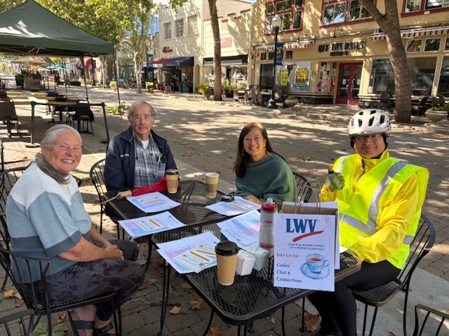 Our Membership Director, Nina, held her first (in-person) Coffee with Members and Friends on October 14, at Sunnyvale’s Coffee and More. A small group of members and one enthusiastic volunteer (friend of a member) came. The gathering is eloquently described by Tim O., "I had a great time! It is so nice to get together with other LWV members. For our democracy to thrive and succeed, we need more people to get together, have a cup of coffee or tea, relax, and just talk. Plus Murphy Ave has become a wonderful public place to socialize in Sunnyvale." Peter B, another attendee, reflected, “Many times I go to a LWV meeting but I don’t know anyone. As I left the coffee session, I felt like I had had coffee with my neighbors. I felt like I made new friends.”